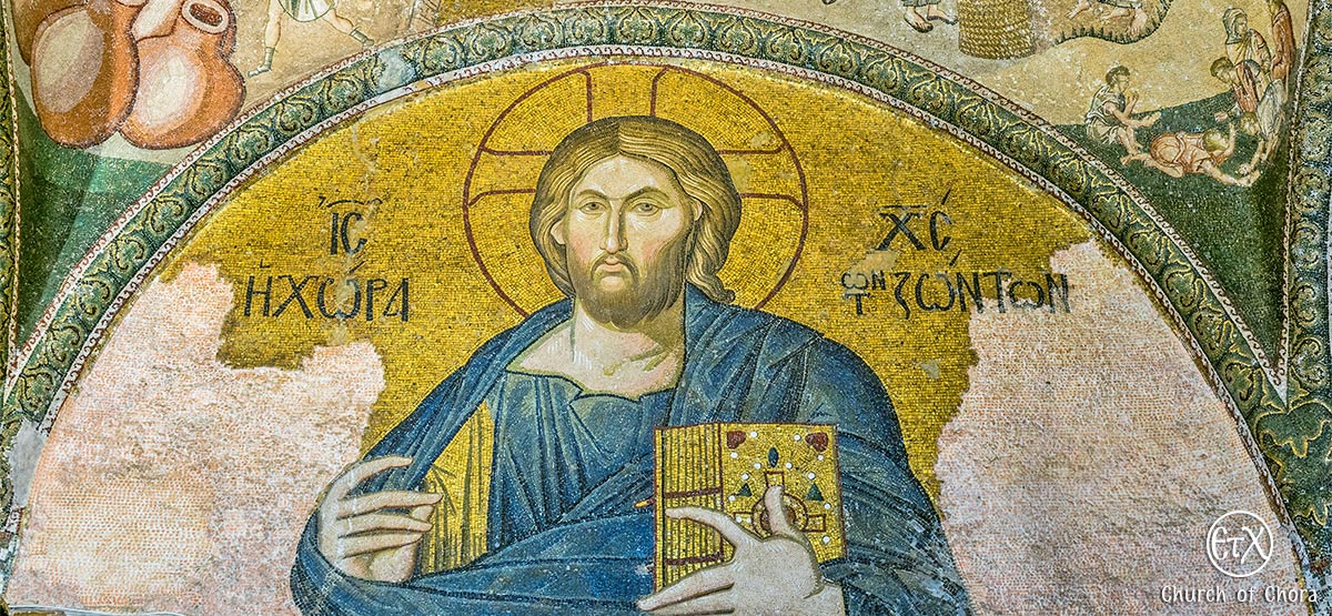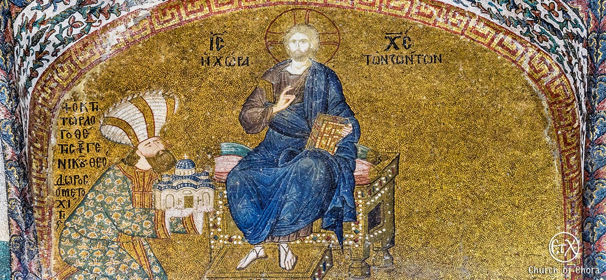 The Enthroned Christ and the Donor mosaic is located at the inner narthex above the entrance to the Naos. Christ, the Land of the Living, is seated and on the left Theodoros Metochites is offering a model of the church to Christ.