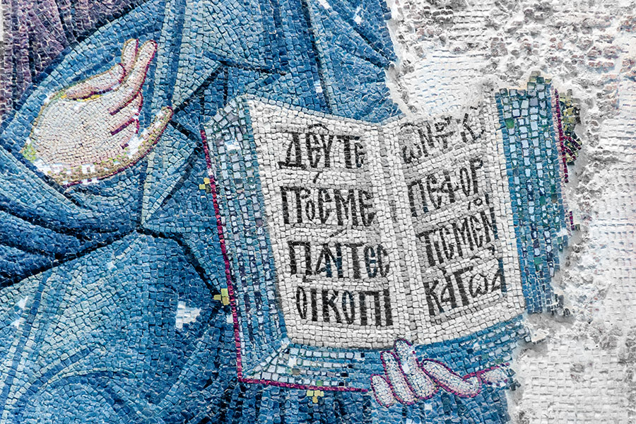 The mosaic of Jesus Christ is at the north side of the templon panel of the bema standing in full profile holding the Book of Gospels, open to Matthew 11:28.
