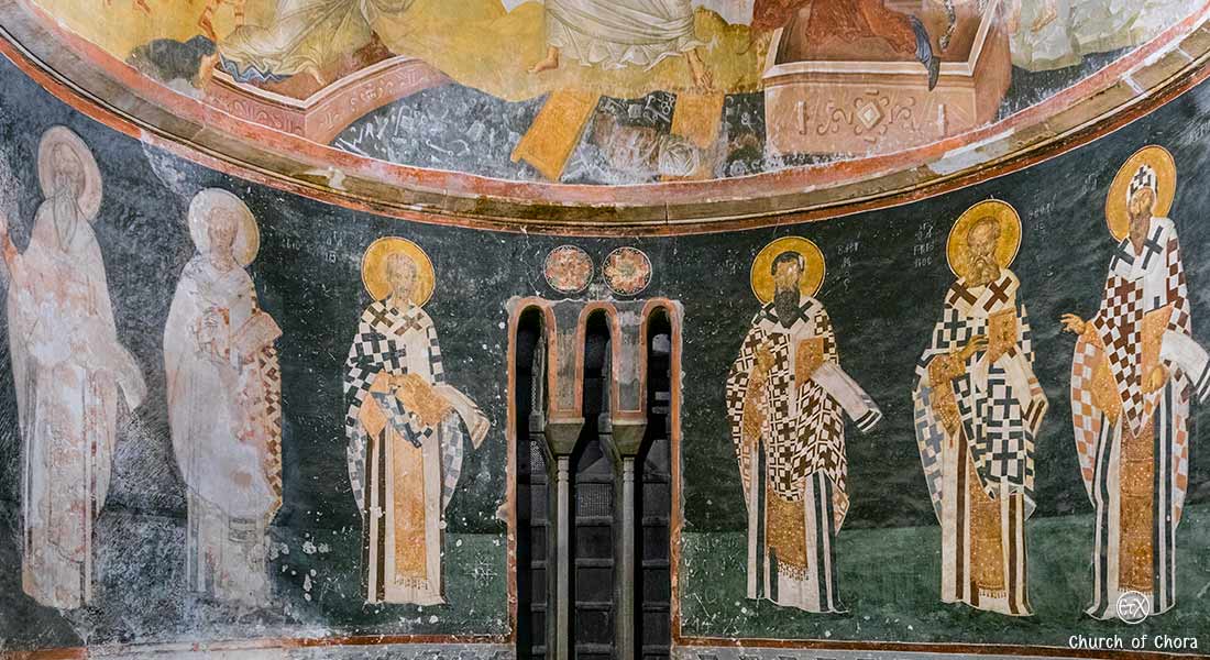 Parekklesion on its walls hosts a plethora of full-figure portraits of martyrs and warrior saints, holy persons recognized by the Byzantines as mediators to reach God. These depictions of Martyrs start from the southern wall to the west until the northeast.