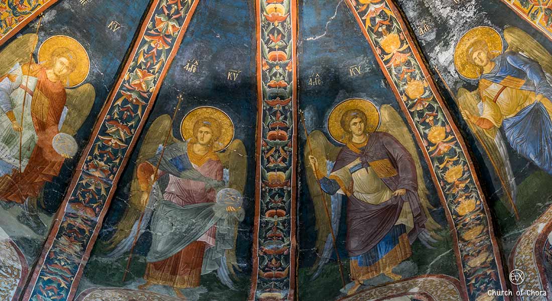 On the western part of the chapel the theme of incarnation is evident in the medallion of the dodecagonal ribbed dome where Virgin and Child is surrounded by a host of angels and Byzantine hymnographers seated on the pendentives of the dome, writing hymns which were incorporated into the funeral services honoring the Virgin and emphasize her role in the process of salvation.